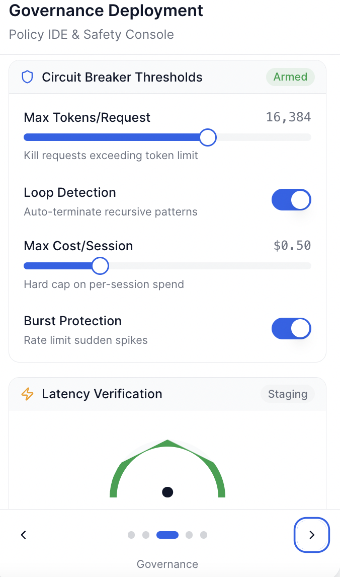 Activate Financial Circuit Breakers. Set real-time session budgets and verify the <1ms loop-kill response in a staging environment.