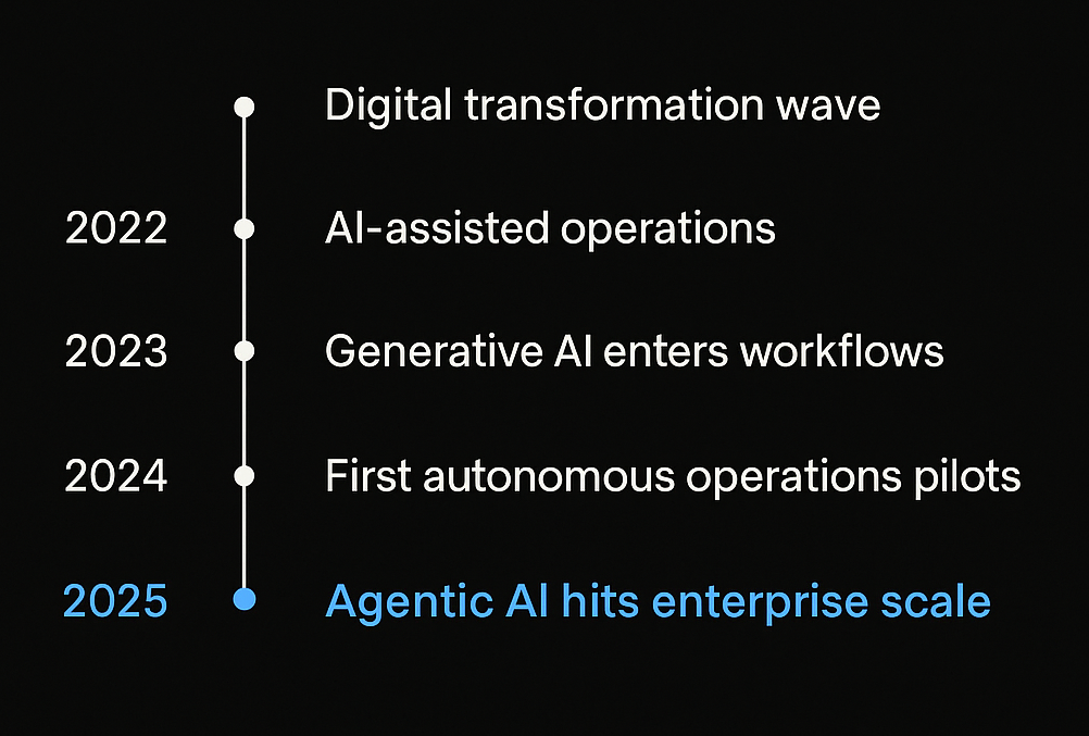 Over the last decade, enterprises have steadily invested in digital transformation, yet many operational teams still rely on fragmented systems, delayed reporting, and manual decision‑making. But the events of early 2025 made one reality undeniable: Operations are entering an era where autonomous, agent‑driven intelligence becomes the new standard - not an experiment.