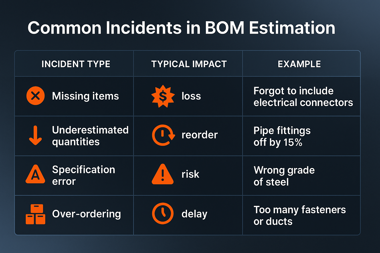 Just like safety incidents, BOM estimation errors can cascade into major operational disruptions. Let’s define these “estimation incidents.”