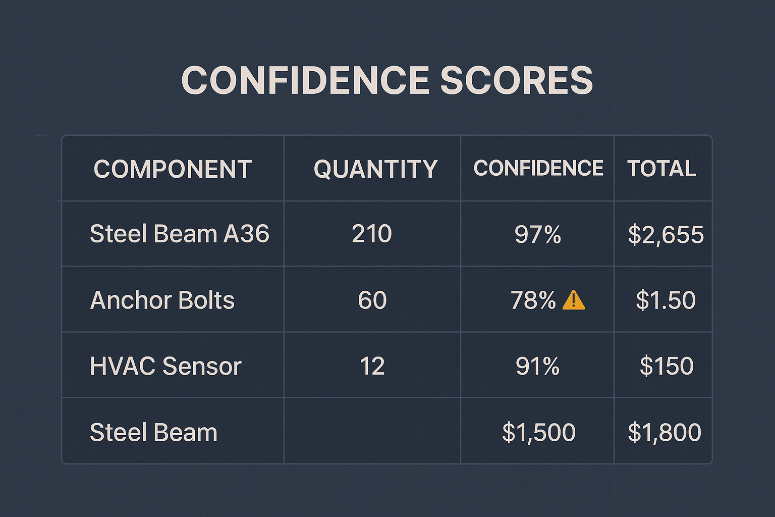 Each BOM line item gets a confidence score - letting project managers focus review efforts where AI is less certain.