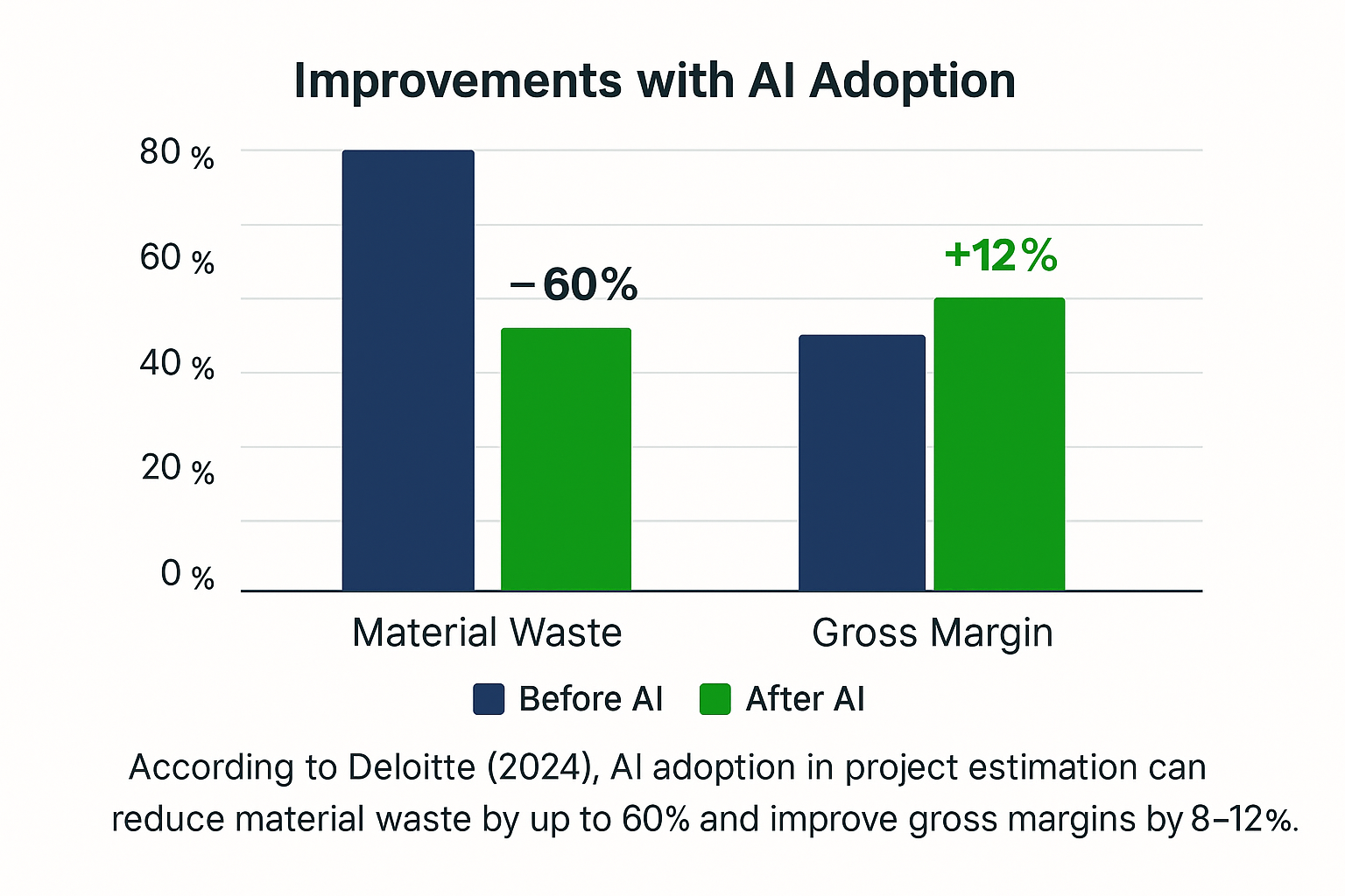 “According to Deloitte (2024), AI adoption in project estimation can reduce material waste by up to 60% and improve gross margins by 8–12%.”