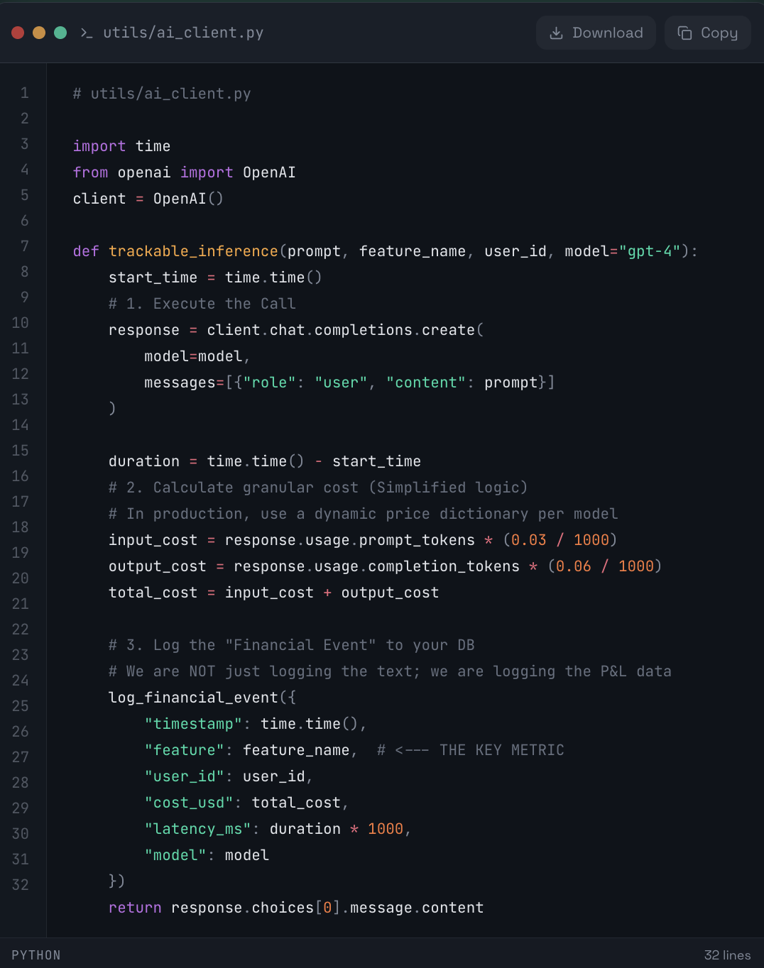 Pricing Changes: OpenAI changes prices. If you hardcode $0.03 in your wrapper, your historical data becomes garbage the next time they drop prices.