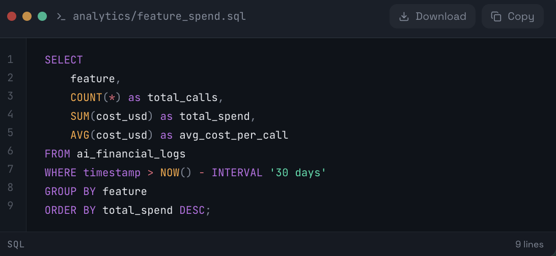 Once your logs are populated, you can run an aggregation query to determine your "Cost to Serve" per feature. This is where the insights appear.