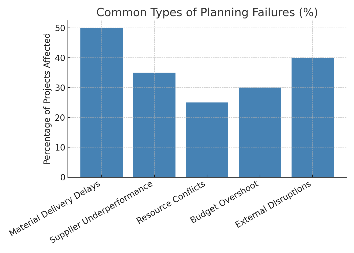 In project management, a planning failure (or planning incident) occurs when the actual execution deviates significantly from the planned schedule, cost, resource allocation, or supply chain sequence, leading to negative impacts on the project’s objectives.