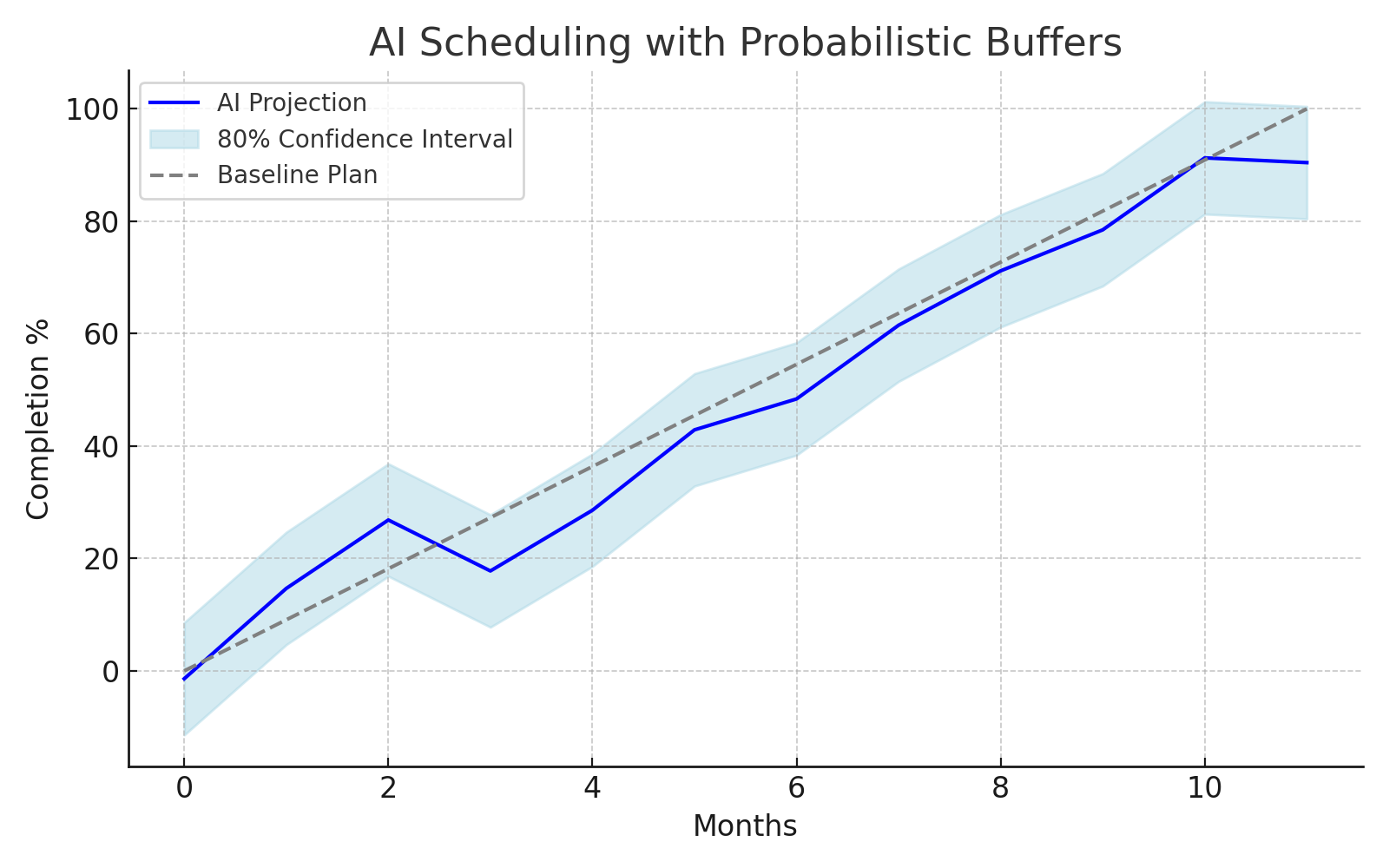 - Show probabilistic buffer margins (i.e. 80% confidence intervals around timeline).