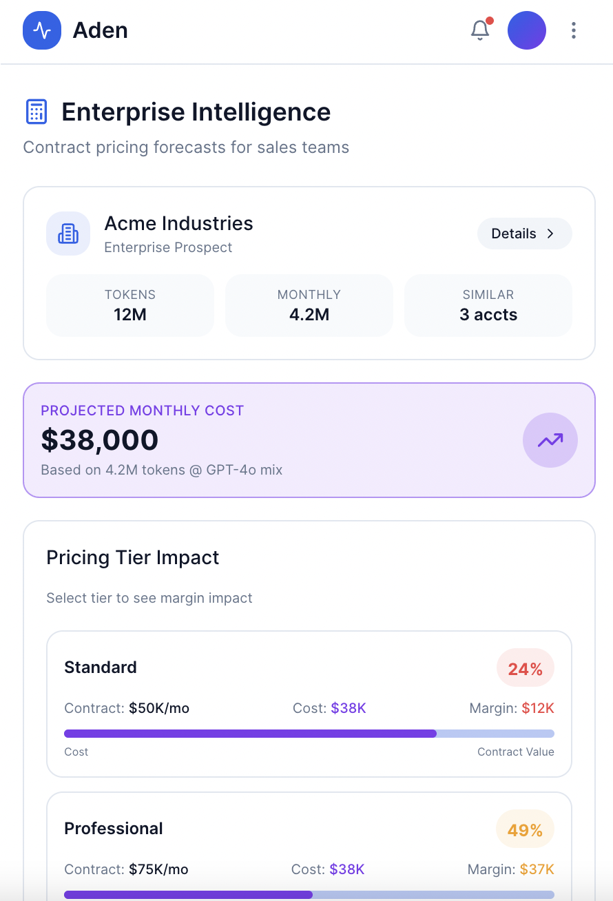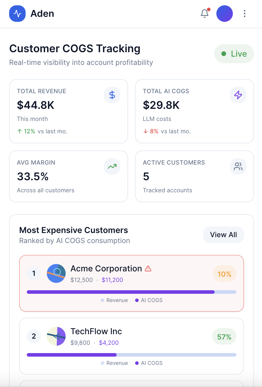When you sell AI features at a fixed price, your highest-usage customers become your least profitable. Aden eliminates the guesswork by mapping every LLM dollar directly to customer revenue, ensuring your AI "wrappers" remain high-margin products as you scale.
