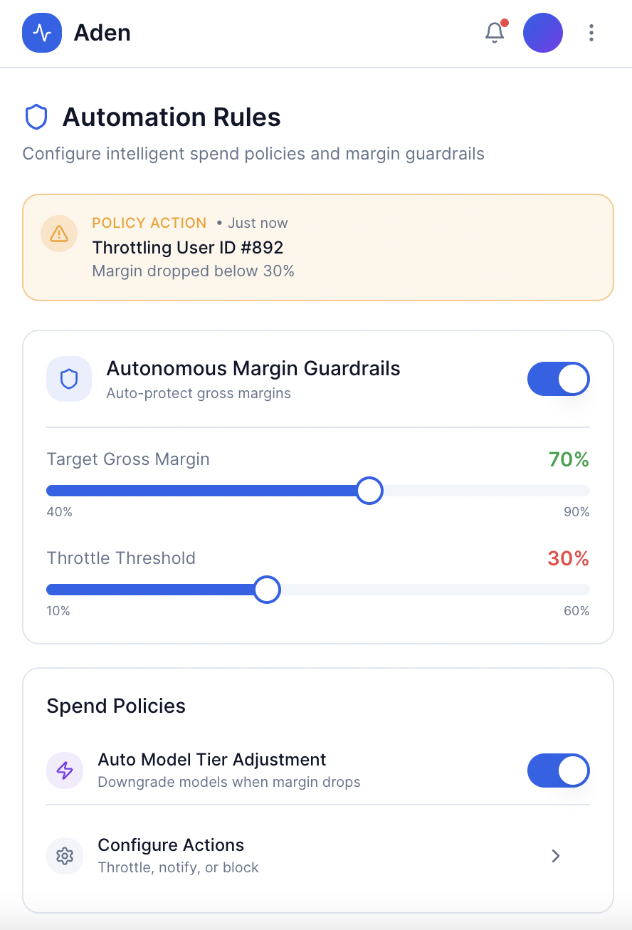 Move beyond generic rate limits. Set intelligent spend policies that automatically throttle or adjust model tiers for specific users when their real-time cost-to-revenue ratio hits a danger zone. Protect your gross margins autonomously without impacting your average users.