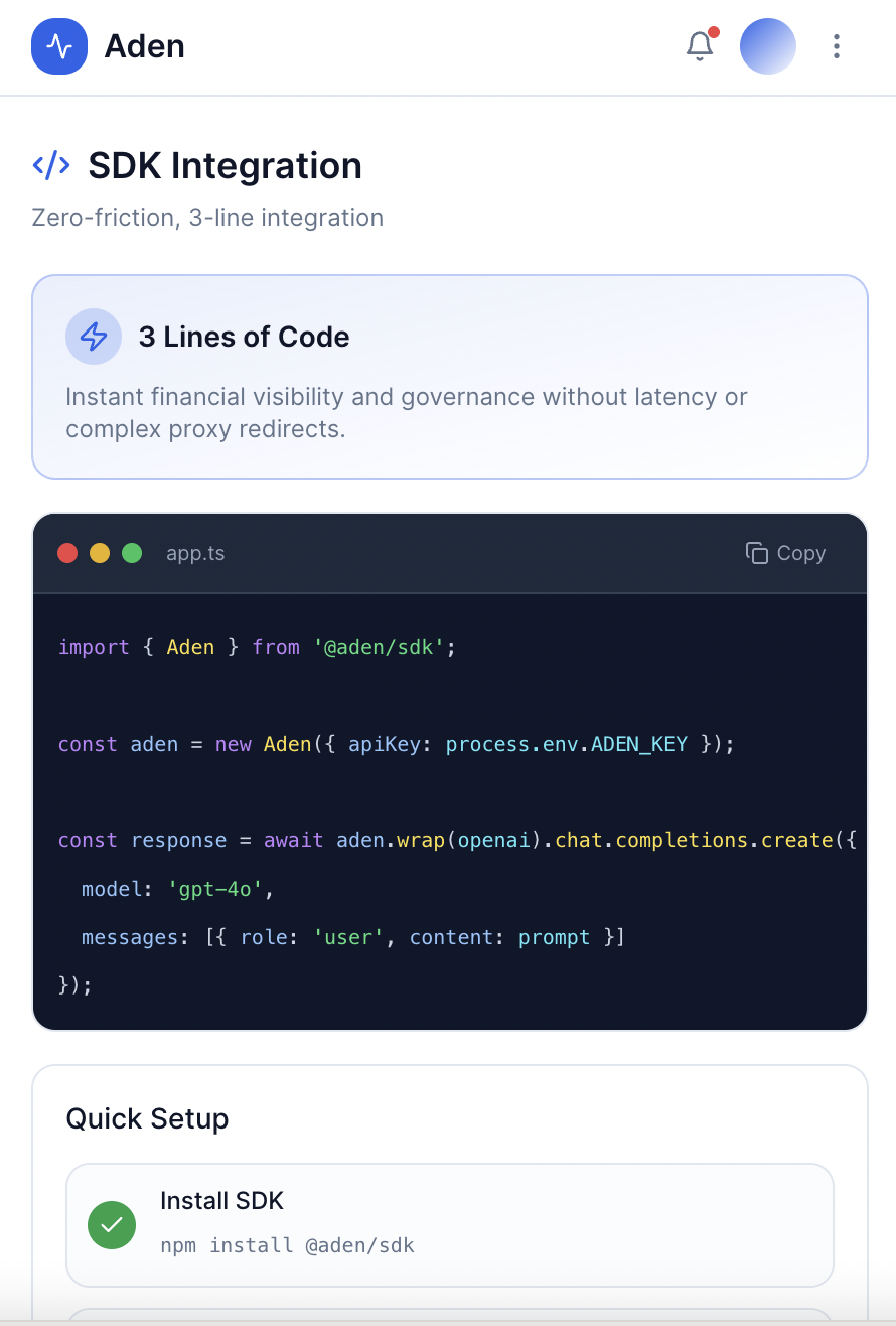Stop worrying about architectural overhead. Aden integrates via a lightweight, 3-line SDK wrapper that secures your margins without adding latency or requiring complex proxy redirects. Keep your existing model providers while gaining instant financial visibility.